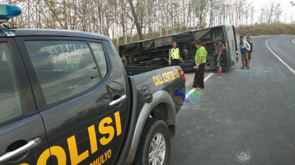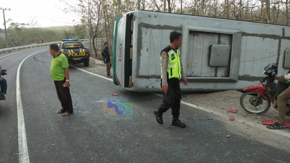 “Agar tidak terjadi tabrakan dengan truk tersebut, pengemudi bus menghindar dengan membanting kemudinya ke kiri, namun sayang, pengemudi bus tersebut tidak dapat menguasai laju kendaraanya sehingga selip hingga akhirnya bus tersebut terguling.” jelas Kapolsek.