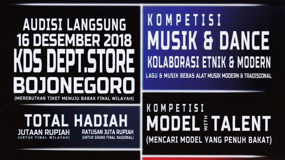 ~ Audisi di Toko KDS Bojonegoro ini akan memilih beberapa Finalis dan mendapatkan plakat/piagam penghargaan yang dapa melanjutkan ke babak Final wilayah Jawa Timur.