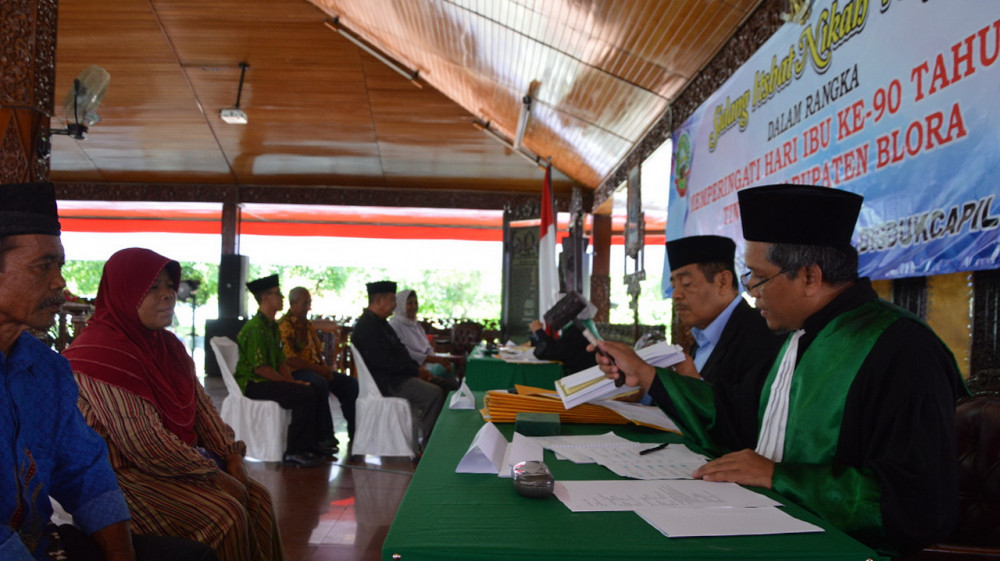 Blora - Dalam rangka memperingati Hari Ibu ke-90, Pemerintah Kabupaten Blora melalui Dinsos P3A, Pengadilan Agama, Kemenag, Dikdukcapil, selenggarakan sidang itsbat nikah secara massal, di Pendapa Rumah Dinas Bupati Blora.