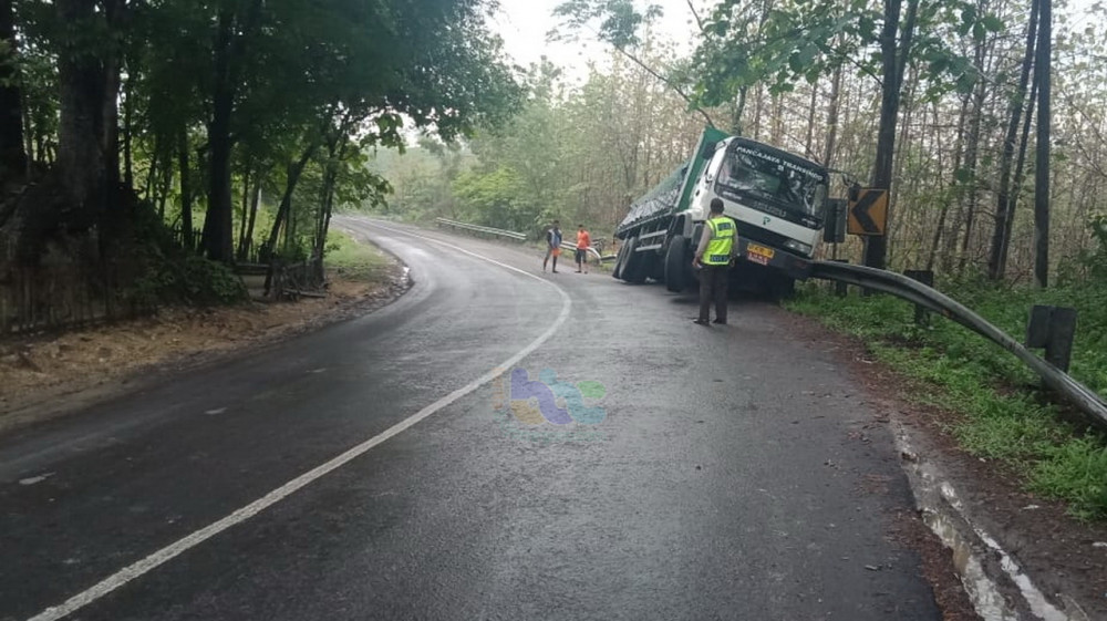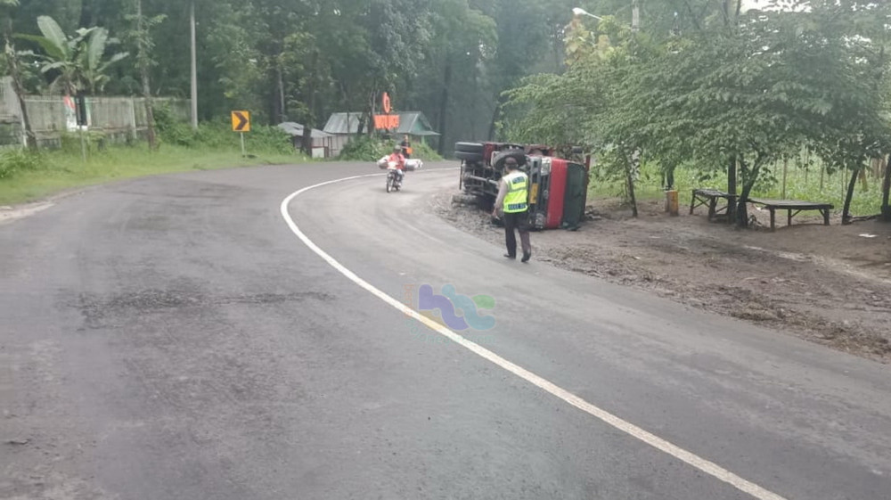 “Diduga karena licin dan kondisi jalan sedikit miring ke kiri, sehingga truk tersebut tergelincir haingga akhirnya terguling,” kata Kapolsek.