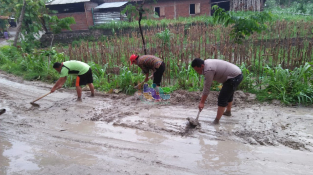 Saat ini, aparat bersama perangkat desa dan warga setempat sedang berupaya membersihkan lumpur dari sisa-sisa banjir tersebut.