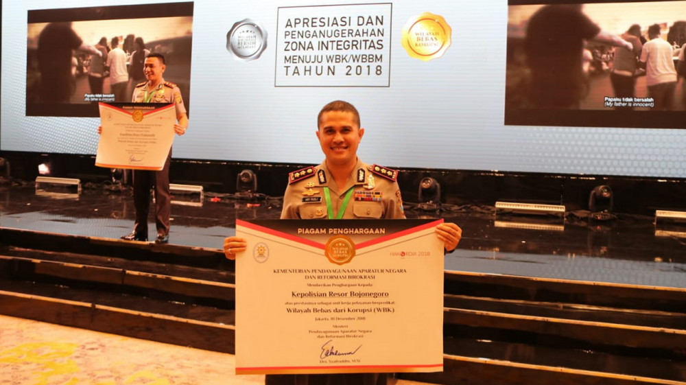 Jakarta - Dalam acara apresiasi dan penghargaan Zona Integritas menuju Wilayah Bebas dari Korupsi (WBK) dan Wilayah Birokrasi Bersih Melayani (WBBM), yang diselenggarakan oleh Kementerian Pendayagunaan Aparatur Negara dan Reformasi Birokrasi (PAN-RB), Polres Bojonegoro menjadi salah satu unit kerja yang berhasil meraih predikat Wilayah Bebas dari Korupsi (WBK).