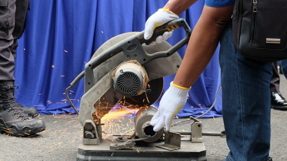 Usia memberikan keterangan pers, Kapolres bersama Forpinda dan anggota FKOB langsung melakukan pemusnahan secara langsung dengan memotong knalpot brong menggunakan mesin potong. (red/imm)