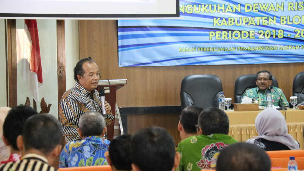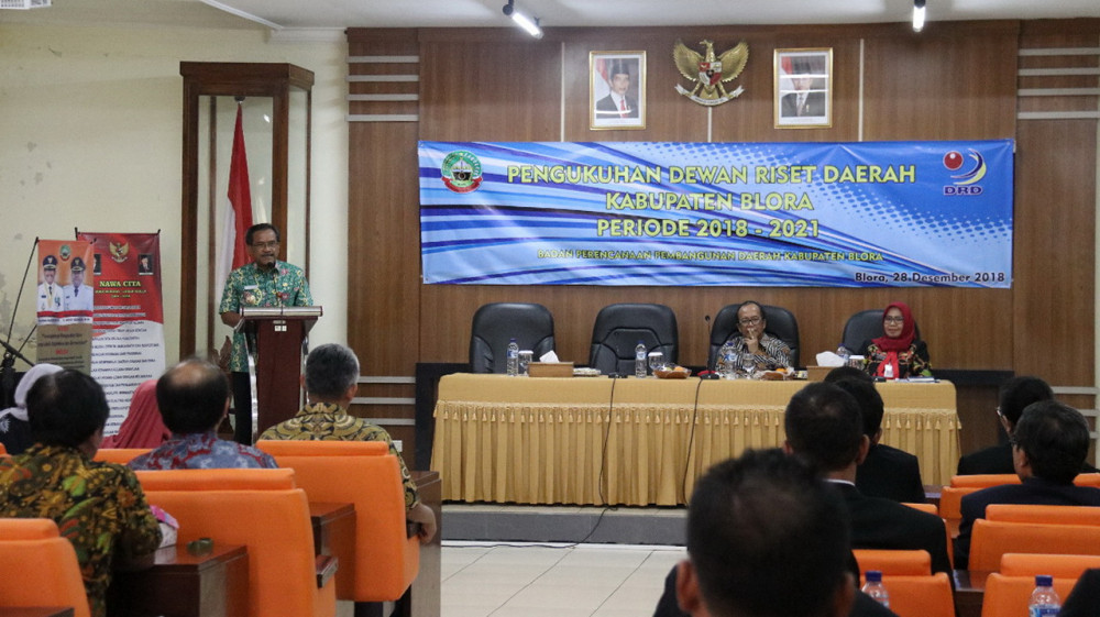 Blora - Kepengurusan Dewan Riset Daerah (DRD) Kabupaten Blora pada Jumat (28/12/2018) secara sah telah dikukuhkan oleh Bupati Blora Djoko Nugroho. Bertempat di Ruang Pertemuan Setda Kabupaten Blora, pengukuhan disaksikan langsung oleh Ketua Dewan Riset Nasional (DRN), DR Bambang Setiadi IPU dan Plt Kepala Bappeda Blora, Ir Reni Miharti MAgr Bus.