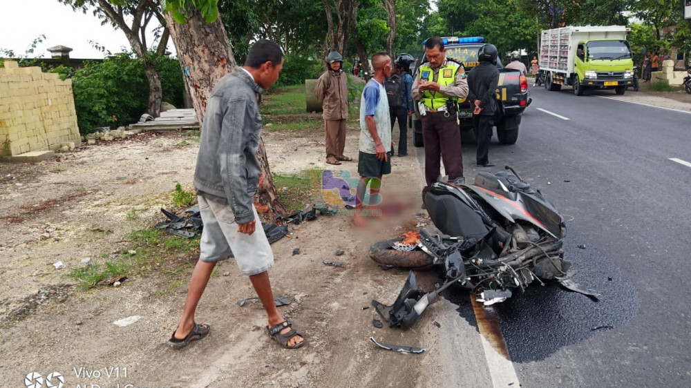 Diduga pengendara sepeda motor mengantuk sehingga kendaraannya oleng dan menabrak pohon mahoni di pinggir jalan. Akibatnya, pengendara motor tersebut mengalami luka-luka dan meninggal dunia di lokasi kejadian.