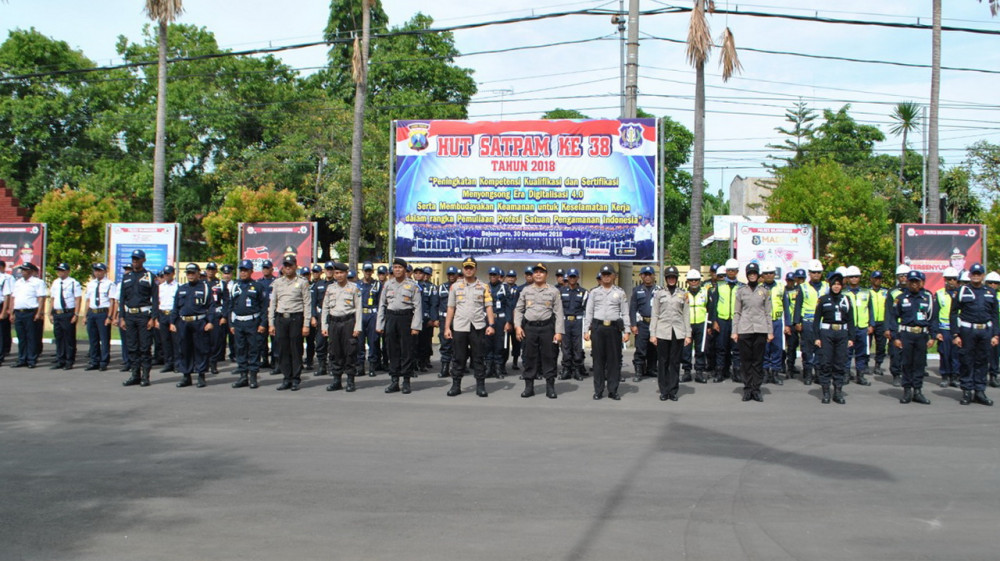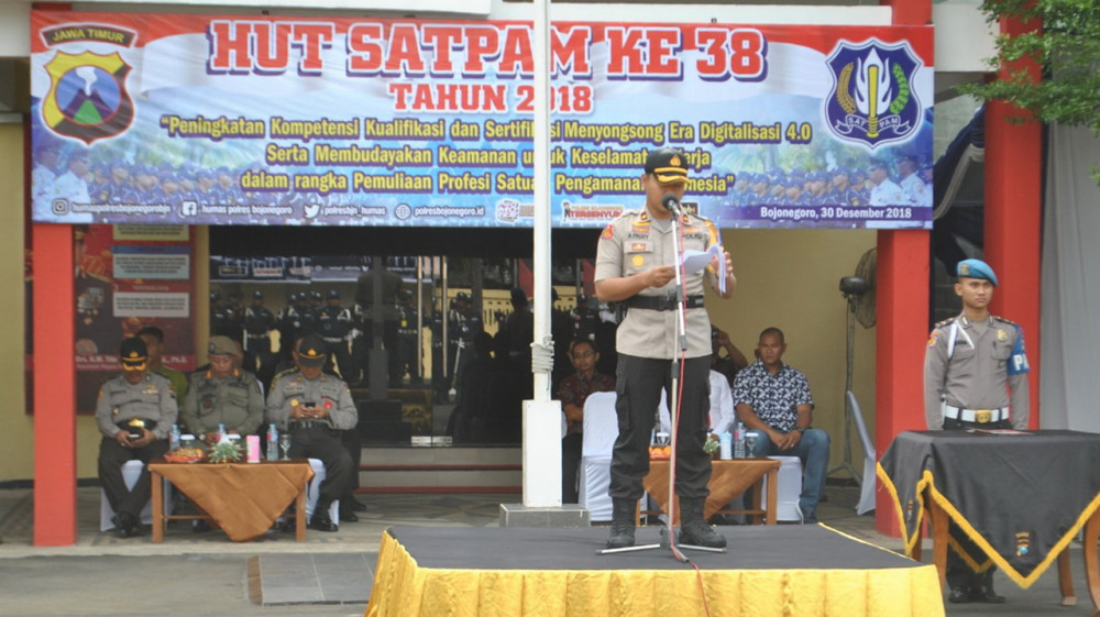 Bojonegoro - Upacara peringatan Hari Ulang Tahun (HUT) Satuan Pengamanan (Satpam) ke 38 tahun 2018, digelar pada Minggu (30/12/2018) pagi di halaman Mapolres Bojonegoro, dipimpin oleh Wakapolres Bojonegoro, Kompol Achmad Fauzy SIK MH MIK. Selain di Bojonegoro, upacara peringatan HUT Satpam digelar secara serentak di seluruh Indonesia.