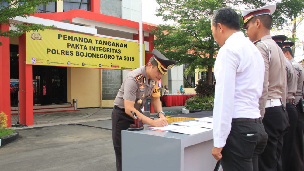 Bojonegoro - Pejabat Utama Polres Bojonegoro pada Rabu (02/01/2019) pagi, lakukan penanda tanganan pakta integritas, sebagai bentuk komitmen membangun lingkungan atau wilayah kerja yang bebas dari praktik korupsi (WBK), di masing-masing satuan kerja (satker) yang dipimpinnya.