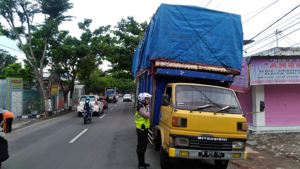 Bojonegoro - Anggota jajaran Sat Lantas Polres Bojonegoro, pada Kamis (03/01/2019) kemarin sore, menghentikan sebuah truk yang bermuatan melebihi kapasitasnya, di Jalan Basuki Rahmad Bojonegoro Kota. Selanjutnya terhadap pengemudi truk tersebut oleh petugas diberikan tindakan dengan memberikan surat tilang.