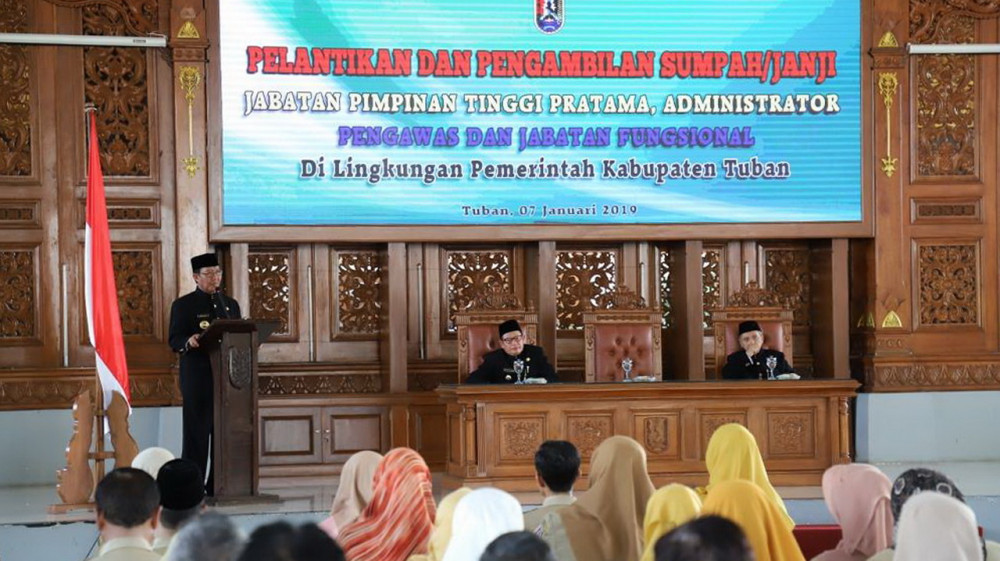 Tuban - Bupati Tuban Fathul Huda, pada Senin (07/01/2019), bertempat di Pendapa Kidro Manunggal, lantik 153 Aparatur Sipil Negara (ASN) di lingkup Pemerintah Kabupaten Tuban, untuk mengisi jabatan Pimpinan Pratama, Administrator, Pengawas, dan jabatan fungsional.