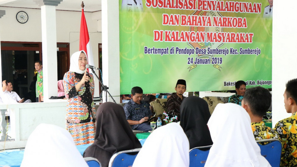 Bojonegoro - Bupati Bojonegoro, DR Hj Anna Muawanah, pada Kamis (24/01/2019) pagi, bertempat di Pendapa Balai Desa Sumberejo Kecamatan Sumberejo, hadiri sekaligus membuka acara Sosialisasi Penyalahgunaan dan Bahaya Narkoba di kalangan Masyarakat.