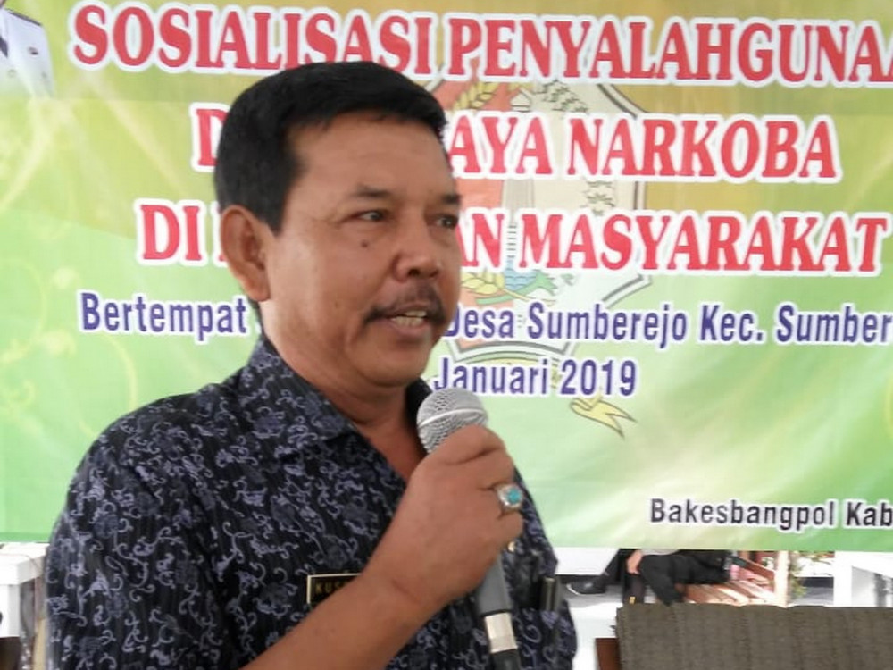 Kepala Badan Kesbangpol Kabupaten Bojonegoro, Drs Kusbiyanto, saat memberikan sambutan dalam acara Sosialisasi Penyalahgunaan dan Bahaya Narkoba di kalangan Masyarakat, Kamis (24/01/2019)