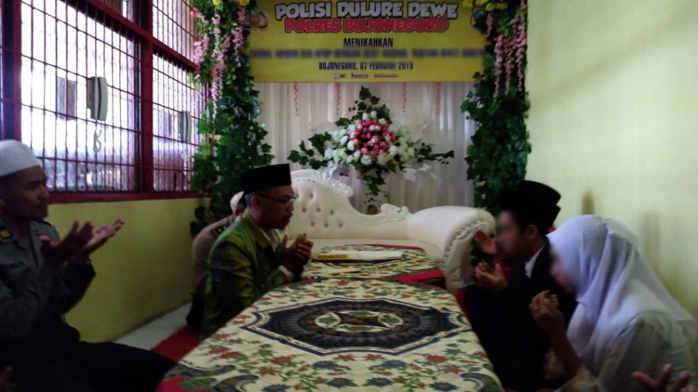 Bojonegoro - Seorang pemuda yang terjerat kasus hukum, berinisial ZA bin AYB (26) warga Kecamatan Kapas Kabupaten Bojonegoro, yang saat ini sedang menjalani proses penyidikan dan ditahan di ruang tahanan Polres Bojonegoro, pada Kamis (07/02/2019) pukul 11.WIB siang tadi, melangsungkan pernikahan atau akad nikah dengan seorang perempuan berinisial DKT binti SG (17), di Polres Bojonegoro.
