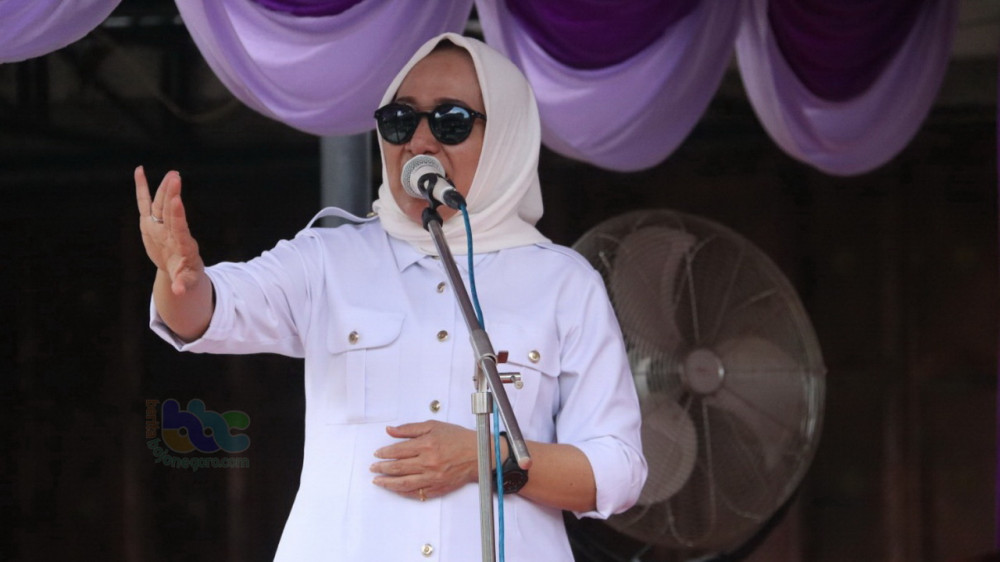 Bupati Bojonegoro, Dr Hj Anna Muawanah saat memberikan sambutan dalam Sosialisasi Kampung KB, di halaman rumah Kepala Desa Sidomukti Kecamatan Kasiman Bojonegoro, Rabu (20/02/1019)