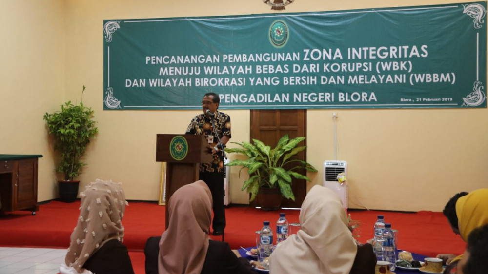 Blora - Pengadilan Negeri (PN) Blora, canangkan Pembangunan Zona Integritas (ZI) menuju Wilayah Bebas dari Korupsi (WBK) dan Wilayah Birokrasi Bersih dan Melayani (WBBM), Rabu (21/2/2019). Dalam kegiatan tersebut, ditandai dengan penandatanganan pakta integritas dan dilanjutkan dengan pembacaan pakta integritas oleh segenap karyawan di PN tersebut.