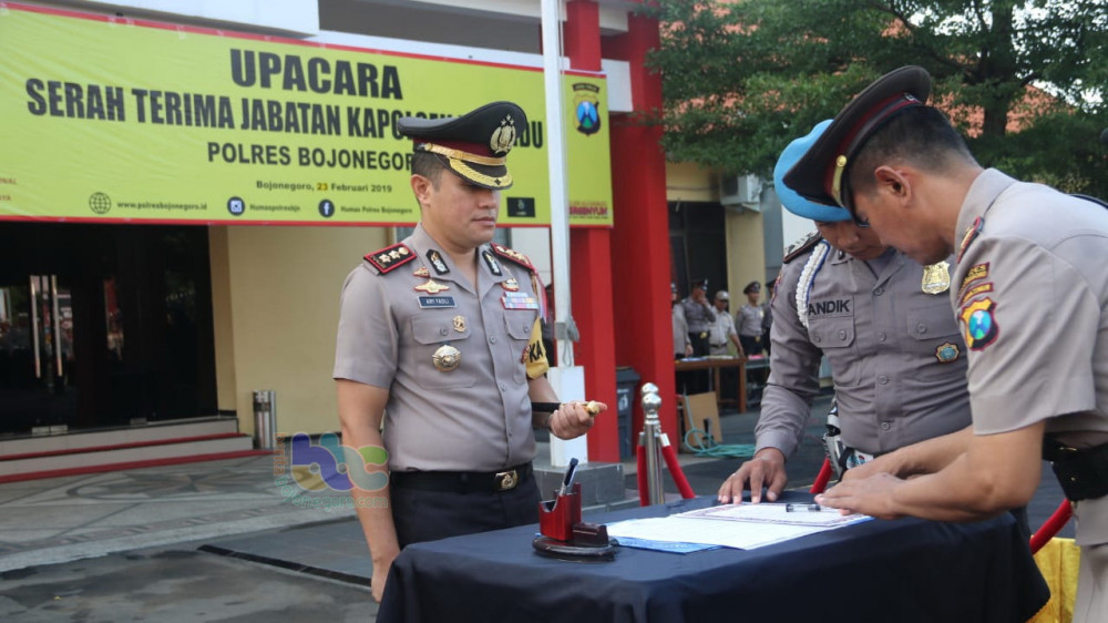Bojonegoro - Kapolres Bojonegoro AKBP Ary Fadli SIK MH MSi, pada Sabtu (23/02/2019) pagi tadi, di halaman Mapolres Bojonegoro, laksanakan upacara serah terima jabatan (sertijab) Kapolsek Kalitidu, dari AKP Sugimat SAg kepada AKP Syabain Rahmad SH.