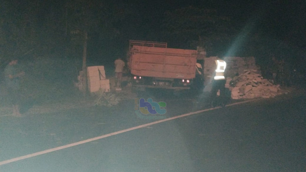 Kendaraan truk bermuatan bahan bangunan berupa bata ringan (herbel), saat hendak berbelok untuk masuk ke gudang, terguling, dengan kondisi sebagian badan truk dan muatannya tumpah di badan jalan, sehingga sempat mengganggu arus lalulinta di jalur tersebut.