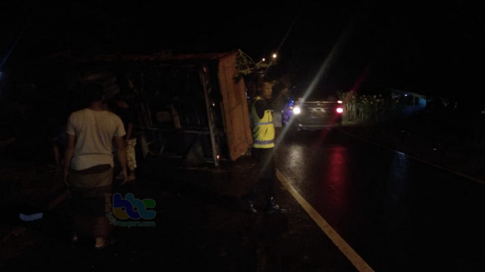 Truk nomor polisi S 8967 A yang terguling di jalan raya jurusan Bojonegoro - Ngawi, turut wilayah Dusun Payung Desa Geneng Kecamatan Margomulyo Bojonegoro, Rabu (06/03/2019) malam.