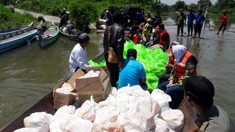 PMI Bojonegoro saat salurkan bantuan pada korban banjir di Kecamatan Baureno Bojonegoro. Sabtu (09/03/2019)