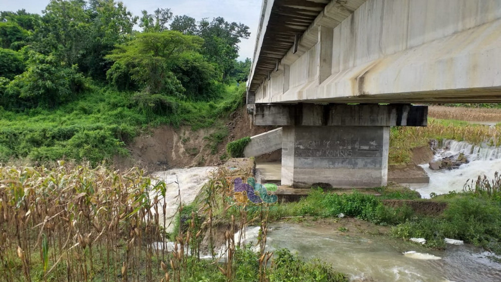 Bojonegoro - Beton penyangga (abutment) fondasi jembatan Kedungjati Desa Kedungsumber Kecamatan Temayang Kabupaten Bojonegoro, sisi selatan, pada Selasa (05/03/2019) lalu ambrol karena tergerus aliran air pembuangan (spillway) Waduk Pacal yang beberapa hari terakhir ini meluap.