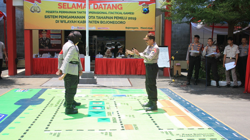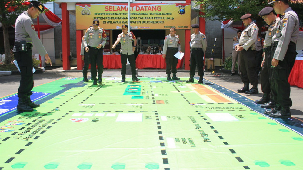 Bojonegoro - Dalam rangka pengamanan Pemilu 2019, Polres Bojonegoro, paparan metode pengamanan, operasional sistem pengamanan kota (sispam kota) melalui permainan taktis atau Tactical Floor Game (TFG), Kamis (14/03/2019) di halaman Mapolres Bojonegoro.