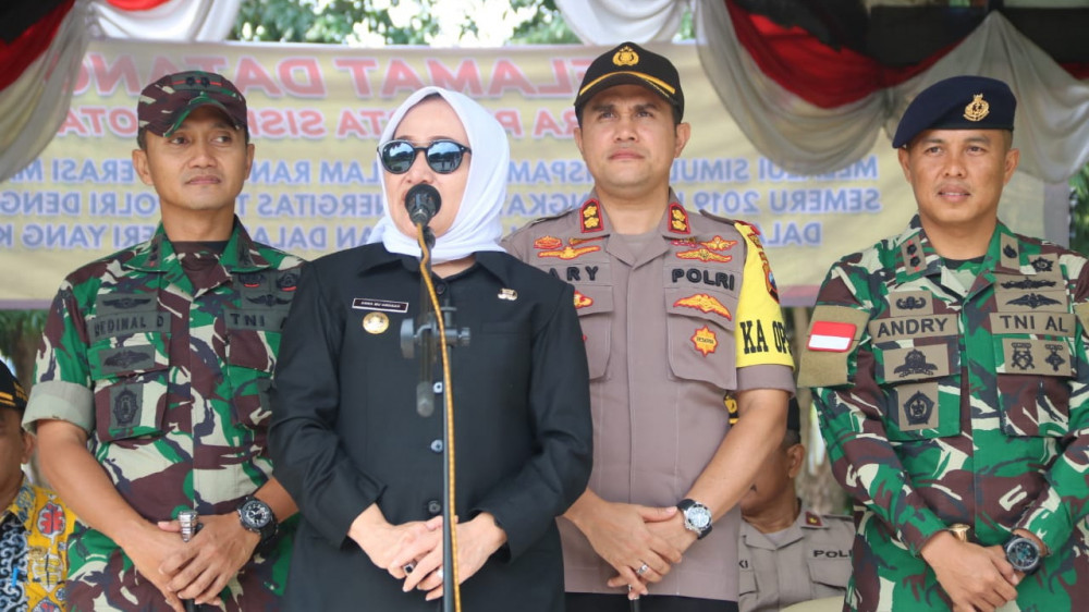 Bojonegoro - Bupati Bojonegoro, Dr Hj Anna Muawanah, pada Kamis (21/03/2019) pagi, bertempat di Alun-alun Kota Bojonegoro, memimpin pelaksanaan apel dan simulasi Sistem Pengamanan Kota (Sispamkota), yang digelar Polres Bojonegoro, dalam rangka kesiapan pengamanan Pemilu 2019 di Kabupaten Bojonegoro,.
