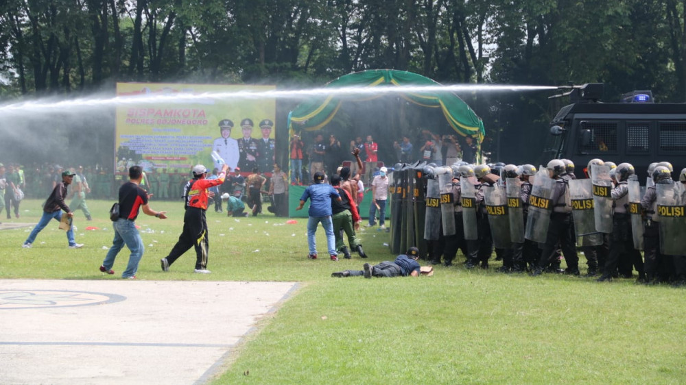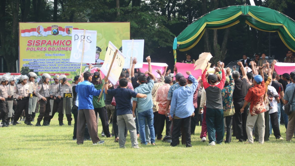 Dalam simulasi tersebut juga dipertontonkan aksi saling dorong antara masa dengan aparat polisi, sehingga penanganan aksi massa yang sesuai prosedur pun diperagakan oleh Polres Bojonegoro beserta unsur keamanan terkait.