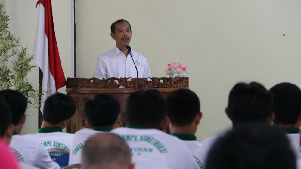 Kabid Tata Ruang dan Jasa Konstuksi, Dinas PUPR Bojonegoro, Khusaifi Ivan Rahmanto ST MM, saat beri sambuatan dalam acara Pelatihan dan Uji Sertifikasi Tenaga Terampil Konstruksi. Selasa (26/03/2019).