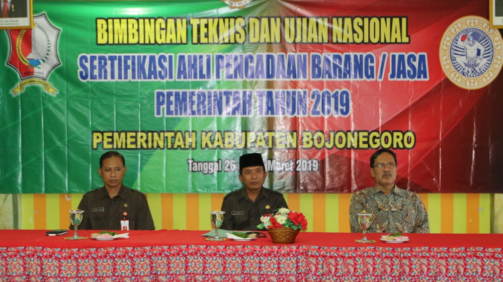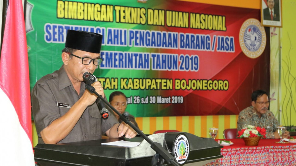 Bojonegoro - Wakil Bupati Bojonegoro, Drs Budi Irawanto MPd, pada Selasa (26/03/2019), bertempat di Aula Gedung Sekolah Menengah Terpadu ( SMT ) Kapas Bojonegoro, hadiri sekaligus membuka acara Bimbingan Tehnis (Bimtek) dan Sertifikasi Ahli Pengadaan Barang dan Jasa Pemerintah Tahun 2019.