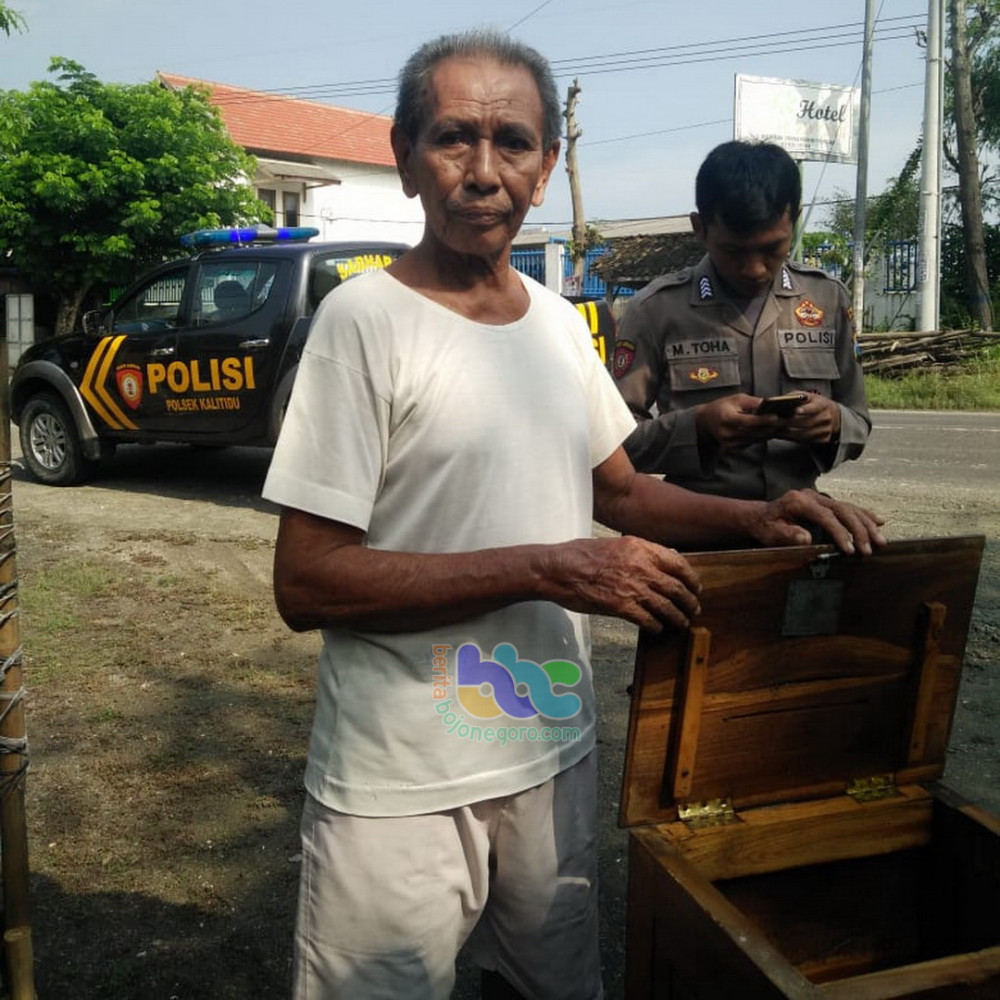 Bojonegoro - Sebuah kotak yang terbuat dari kayu jati, yang diyakini sebagai kotak amal, pada Rabu (27/03/2019) pukul 05.30 WIB pagi tadi, diitemukan oleh Fakih (78), warga Dusun Clangap RT 004 RW 001 Desa Sumengko Kecamatan Kalitidu Kabupaten Bojonegoro.