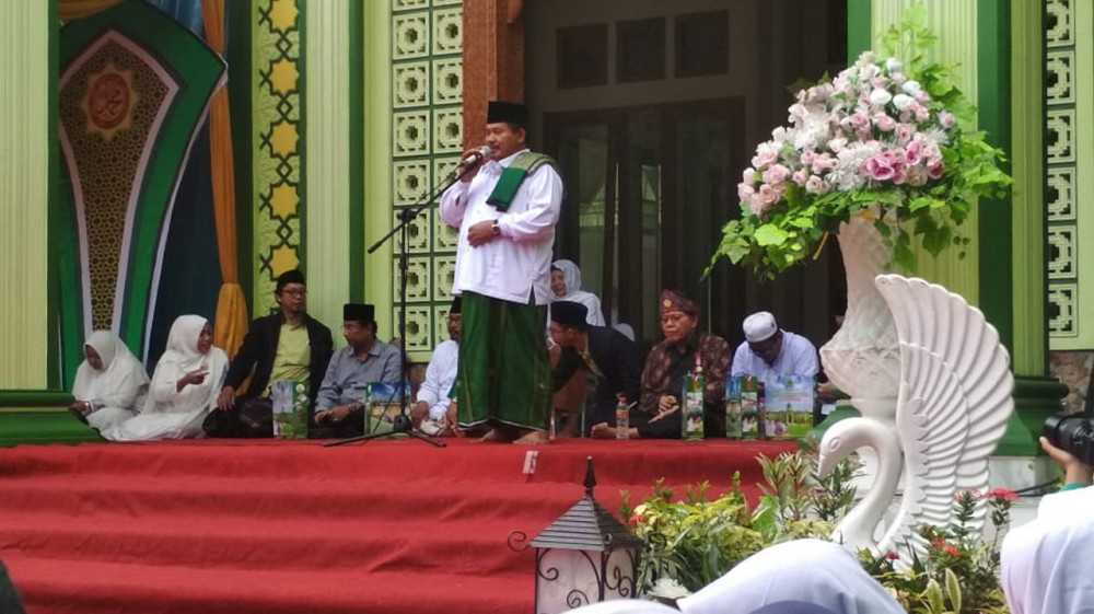 Pengasuh Ponpes Al Fatimah KH Tamam Syaifuddin MSi, saat beri sambutan dalam kunjungan Gubernur Jawa Timur Dra Hj Khofifah Indar Pawansa MSi di Ponpes Modern Al Fatimah Bojonegoro. Rabu (27/03/2019).