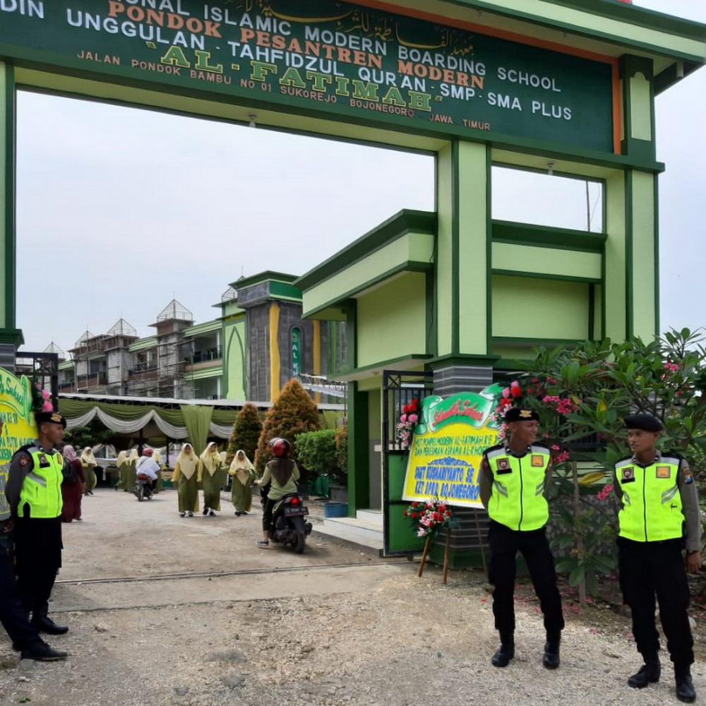 Petugas pengamanan dari Polres Bojonegoro, saat lakukan pengamanan dalam kunjungan Gubernur Jawa Timur Dra Hj Khofifah Indar Pawansa MSi di Ponpes Modern Al Fatimah Bojonegoro. Rabu (27/03/2019).