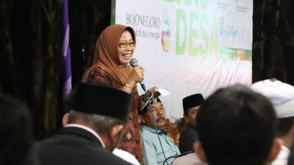 Kepala Dinas Kesehatan (Dinkes) Kabupaten Bojonegoro, Nanik Susmiati SKm MMKes, saat beri sambutan dalam acara Sambang Desa di Desa Pekuwon Kecamatan Sumberrejo. Kamis (28/03/2019) malam