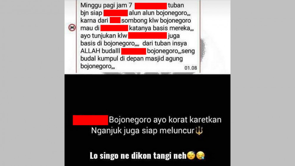 Postingan di media sosial (Facebook) yang berupaya membuat kerusuhan, atau mengajak melakukan kerusuhan (tawuran) saat pelaksanaan kegiatan Karnaval SCTV di Alun-alun Bojonegoro.