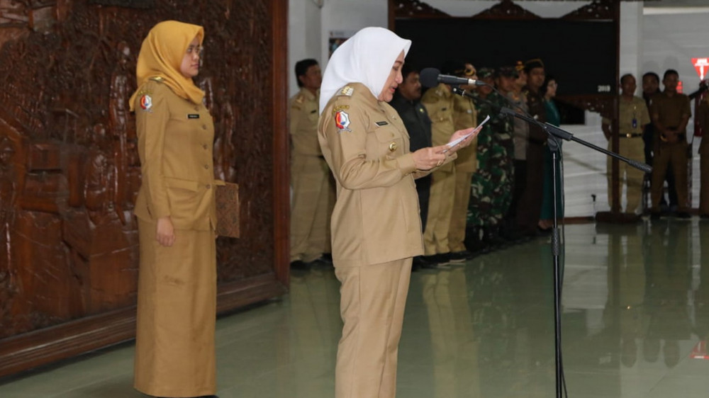 Bupati Bojonegoro, Dr Hj Anna Muawanah, saat beri sambutan dalam acara penerimaan peserta Latsitarda Nusantara ke-39 tahun 2019, di Pendapa Malowopati Pemkab Bojonegoro. Senin (01/04/2019)