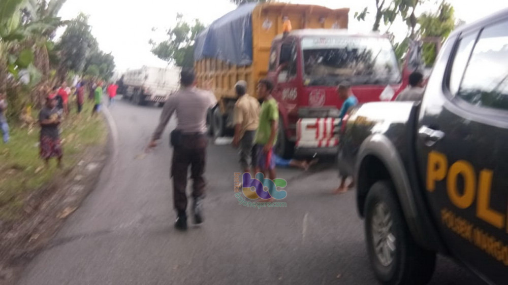 Pengendara sepeda motor yang diduga kurang menguasai medan jalan, saat hendak mendahului kendaraan di depannya, di tikungan jalan, terjatuh dan menabrak truk tronton yang berjalan dari arah berlawanan sehingga terlindas ban depan truk tronton tersebut. Akibatnya, pengendara motor tersebut mengalami luka parah dan segera dilarikan ke rumah sakit.