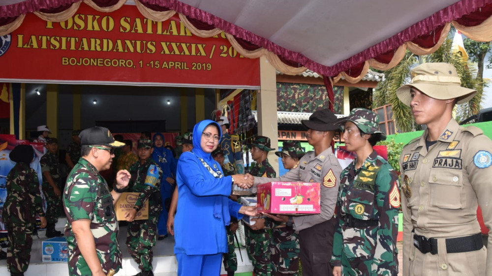 Gubernur AAL, Laksamana Muda TNI Edi Sucipto SE MM bersama Iatri, saat beri bingkisan pada Taruna, Praja dan Mahasiwa Satlak Hiu Satlak Hiu Latsitardanus ke-39 di Desa Bubulan Bojonegoro. Minggu (07/04/2019)