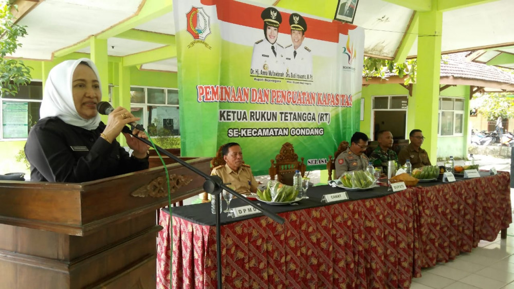 Bupati Bojonegoro, Dr Hj Anna Muawanah saat beri sambutan pada acara Pembinaan dan Penguatan Kapasitas RT dan RW di Kecamatan Gondang. Selasa (09/04/2019).