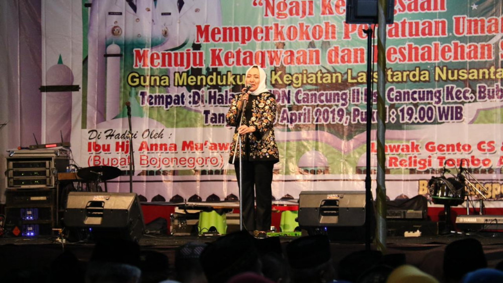 Bupati Bojonegoro Dr Hj Anna Muawanah, saat beri sambutan dalam acara Ngaji Kebangsaan di Kecamatan Bubulan. Rabu (10/04/2019) malam.