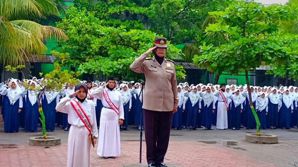 AKP Roro Sri Harwati saat bertindak selaku Inspektur Upacara di Pondok Pesantren Al Fatimah Bojonegoro. Senin (29/04/2019)