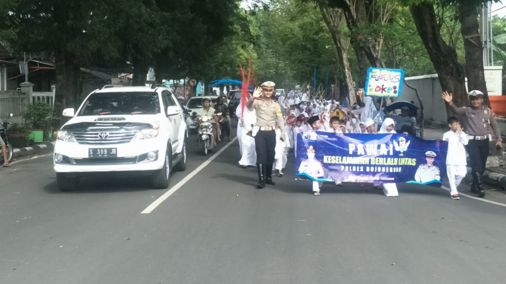 Bojonegoro - Pelaksanaan Operasi Keselamatan 2019 hari kedua, di wilayah hukum Polres Bojonegoro, pada Selasa (30/04/2019), jajaran Sat Lantas Polres Bojonegoro menggelar "Pawai Keselamatan Berlalu Lintas" bersama anak Pendidikan Anak Usia Dini (PAUD) Darussalam, di seputaran Alun-alun Kota Bojonegoro.