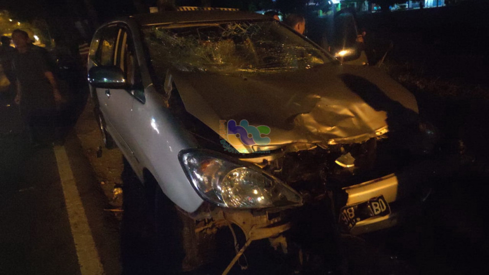 Sepeda motor Yamaha Vixion yang tiba-tiba oleng ke kanan, menabrak kendaraan Toyota Innova yang berjalan dari arah berlawanan. Akibatnya pengendara Vixion berikut pembncengnya mengalami luka-luka.