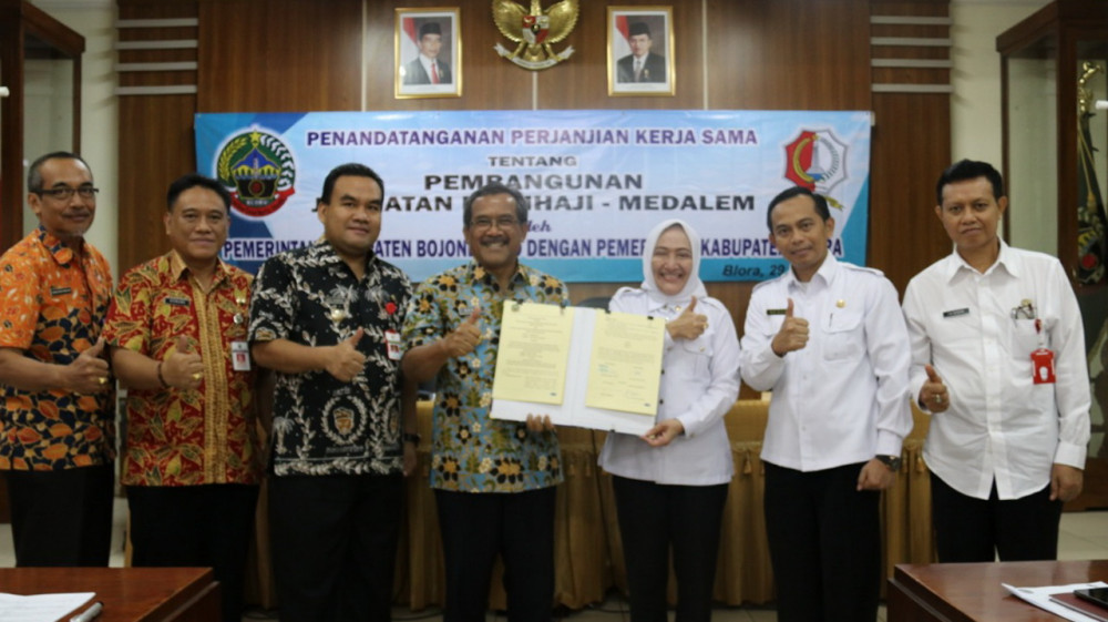 Blora - Pemerintah Kabupaten (Pemkab) Blora dan Pemerintah Kabupaten (Pemkab) Bojonegoro, pada Rabu (29/05/2019), bertempat di Gedung Pertemuan Setda Blora, tandatangani perjanjian kerja sama (PKS) tentang pembangunan Jembatan Bengawan Solo penghubung Desa Luwihhaji Kecamatan Ngraho Kabupaten Bojonegoro, Jawa Timur, menuju Desa Medalem Kecamatan Kradenan Kabupaten Blora, Jawa Tengah.
