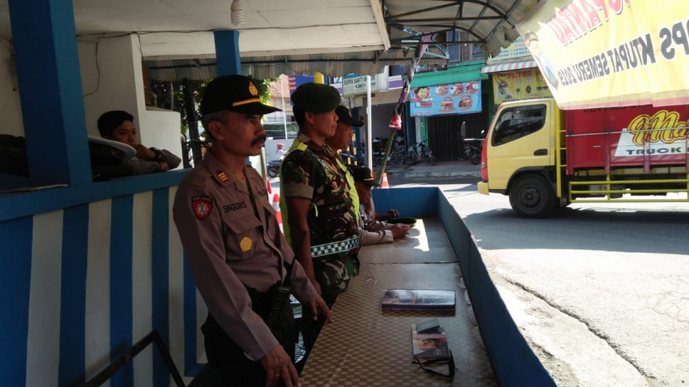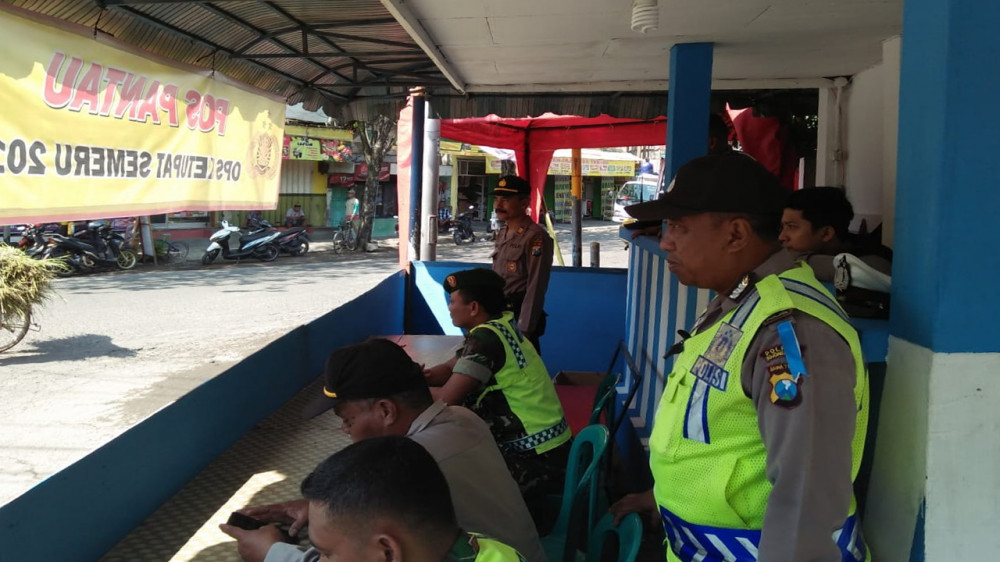 Kapolsek Padangan, Ajun Komisaris Polisi (AKP) Singgih Sujianto bersama anggota, saat laksanakan pemantauan arus mudik lebaran di Pos Pantau Padangan. Kamis (30/05/2019)