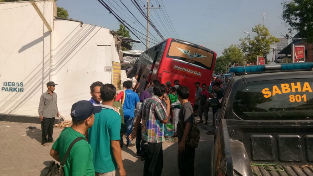 Bus Jaya Utama berpenumpang 50 orang, yang sedang melaju di jalan raya yang cukup padat arus lalu-lintasnya, diduga remnya blong, sehingga pengemudinya membanting kemudi kendaraannya ke kiri hingga akhirnya menabrak rumah warga yang ada di kiri jalan.