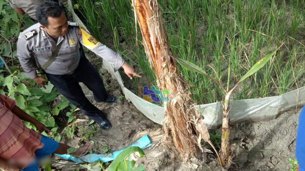 Kapolsek Sukosewu, Ajun Komisaris Polisi (AKP) Pujiono SH, kepada awak media ini menuturkan bahwa berdasarkan keterangan saksi-saksi, kronologi peristiwa tersebut bermula pada Minggu (09/06/2019) sekira pukul 08.30 WIB, saksi Ali Subeki (35), tetangga korban, melihat korban mengambil daun pisang di kebun miliknya.