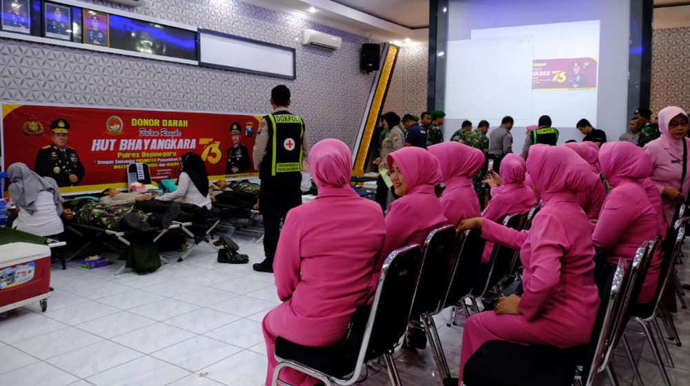 Kegiatan donor darah, dalam rangka Hari Bhayangkara ke-73 tahun 2019 yang digelar Polres Bojonegoro, Rabu (19/06/2019).