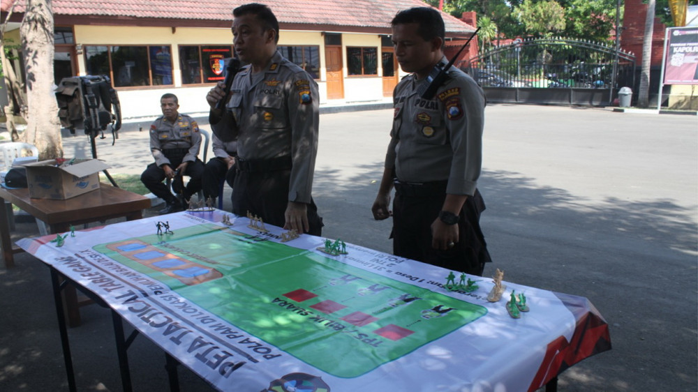 Bojonegoro - Guna persiapan pengamanan pelaksanaan Pemilihan Kepala Desa (Pilkades) Serentak Tahun 2019 di Kabupaten Bojonegoro yang akan digelar pada Rabu (26/06/2019) mendatang, Polres Bojonegoro pada Sabtu (22/06/2019) pagi, bertempat di halaman Mapolres Bojonegoro menggelar simulasi melalui alat peraga Tactical Wall Game (TWG) dan Tactical Floor Game (TFG),