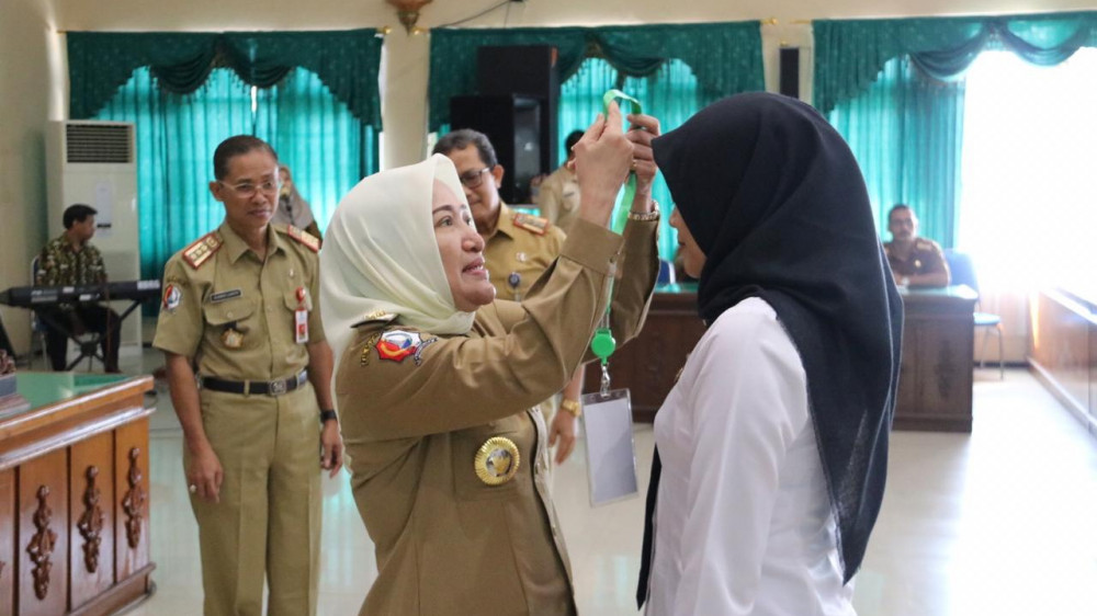 Bupati Bojonegoro, Dr Hj Anna Muawanah, saat menyematkan pita kepada perwakilan peserta, sebagai tanda dimulainya diklat PPGDON di Gedung Angling Dharma Pemkab Bojonegoro, Senin (24/06/2019)