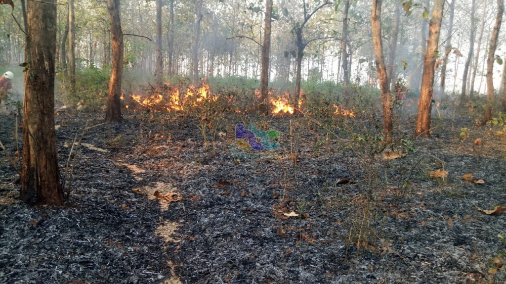 Bojonegoro (Dander) - Kebakaran hutan terjadi di Petak 8A RPH Dander KPH Bojonegoro, turut wilayah Desa Dander Kecamatan Dander Kabupaten Bojonegoro, Senin (24/06/2018) sekira pukul 14.00 WIB. Semak belukar seluas kurang lebih 5 hektare di kawasan hutan tersebut terbakar.
