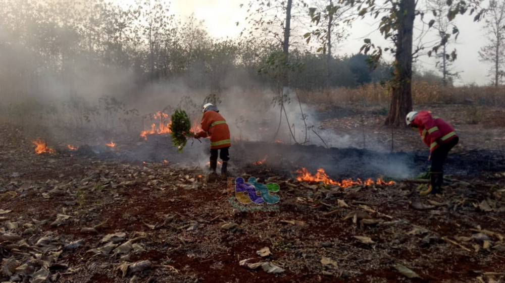 Petugas dari Perhutani Polsek, Koramil dan Satpol PP Dander, bersama petugas pemadam kebakaran Pos Temayang, berupaya memadamkan api secara manual, dengan cara digepyok dengan tanaman basah. Senin (24/06/2019)
